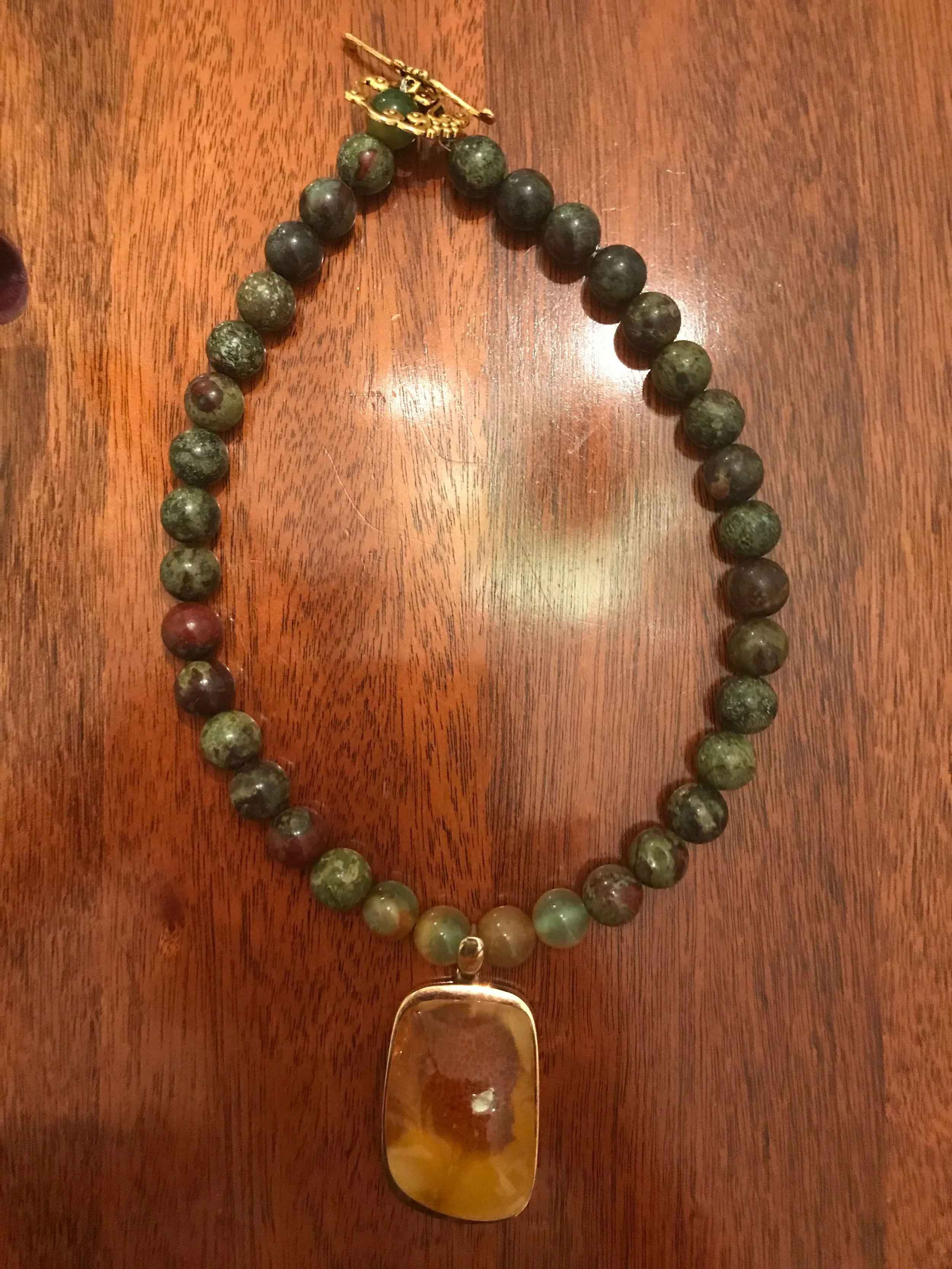 I created this piece using Malachite and Amber. Malachite, primarily used for jewelry, lapidary work, and decorative objects, was first employed as a green pigment in paints and cosmetics. It is often referred to as “the Stone of Transformation,” and serves as a powerful spiritual tool for deep energy cleansing. It is associated with the heart chakra, and encourages emotional, physical, and spiritual renewal. I purchased this pendant, known as Baltic Amber, while in Poland. It is a time-capsule of fossilized tree resin which takes 40-60 million years to form. Pieces containing preserved insects or plants are rare and very expensive. (Unfortunately, mine contains no insects!) Historically, it was used as an aumlet to ward off negative energy, or carried to create a protective barrier against emotional or energetic harm. Frequently referred to as “liquid sunlight,” it is used to boost sagging energy, enhance joy, and increase the wearer’s confidence. It assists in the healing of deep-seated trauma and encourages emotional balance and calmness.