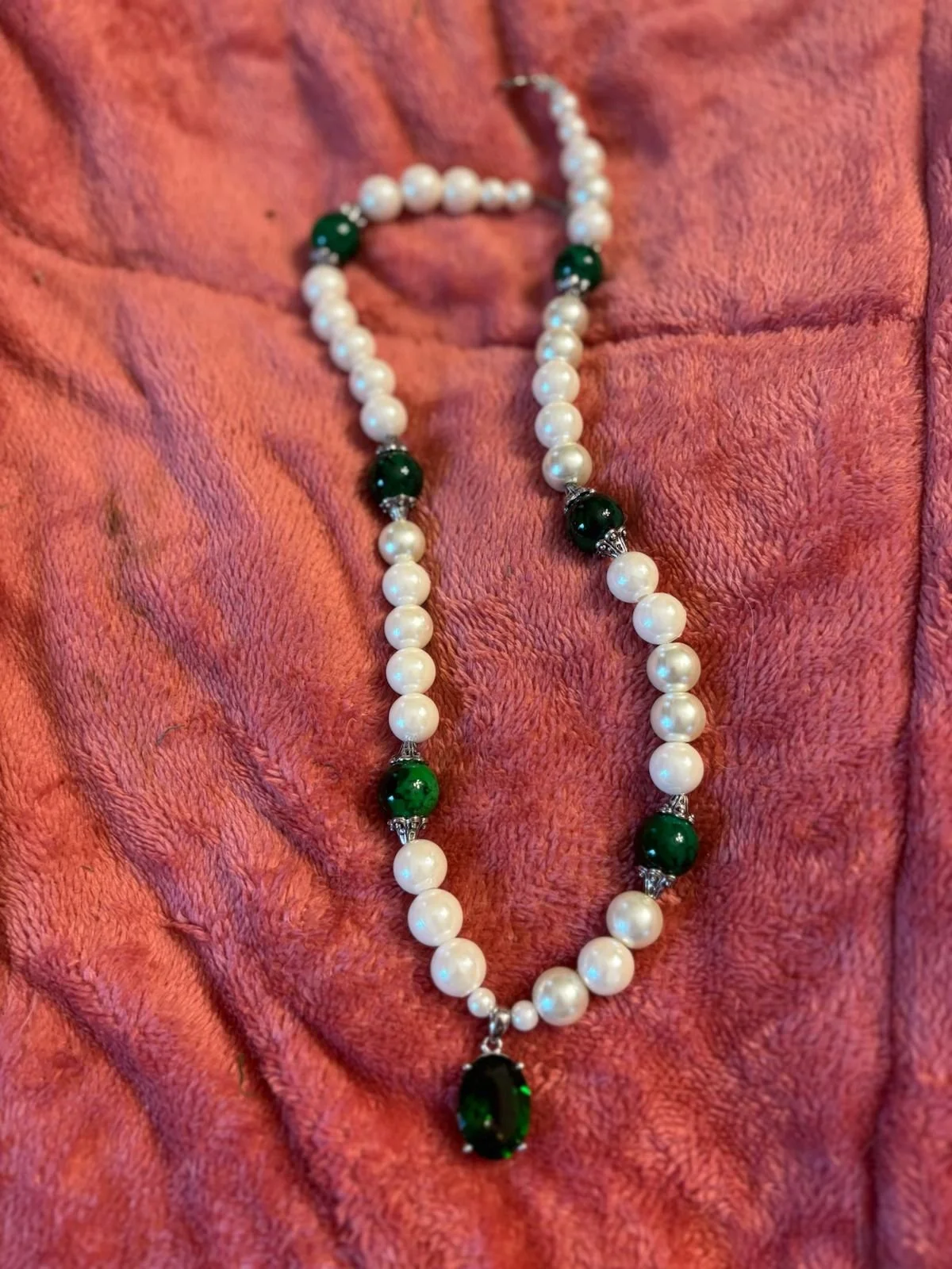 Designing jewelry with natural or created stones is both a avocation and a passion. This necklace features faux pearls and glass beads, with the “star of the show” a Helenite, a man-made stone witch was first created accidentally following the 1980 eruption of Mount St. Helens in the state of Washington. It is made by heating rock dust and particles from the Mount St. Helens area in a furnace to a temperature of approximately 2,700°F. Helenite is also known as Mount St. Helens Obsidian. Known as the “Gaia Stone,” it is used to connect with nature spirits, fostering a deeper, loving connection to Mother Earth. It is believed to help alleviate anger, relieve stress, and heal emotional trauma. This beautiful stone was gifted to my mom, Miss Madeline, by her beloved grandson, Jason.