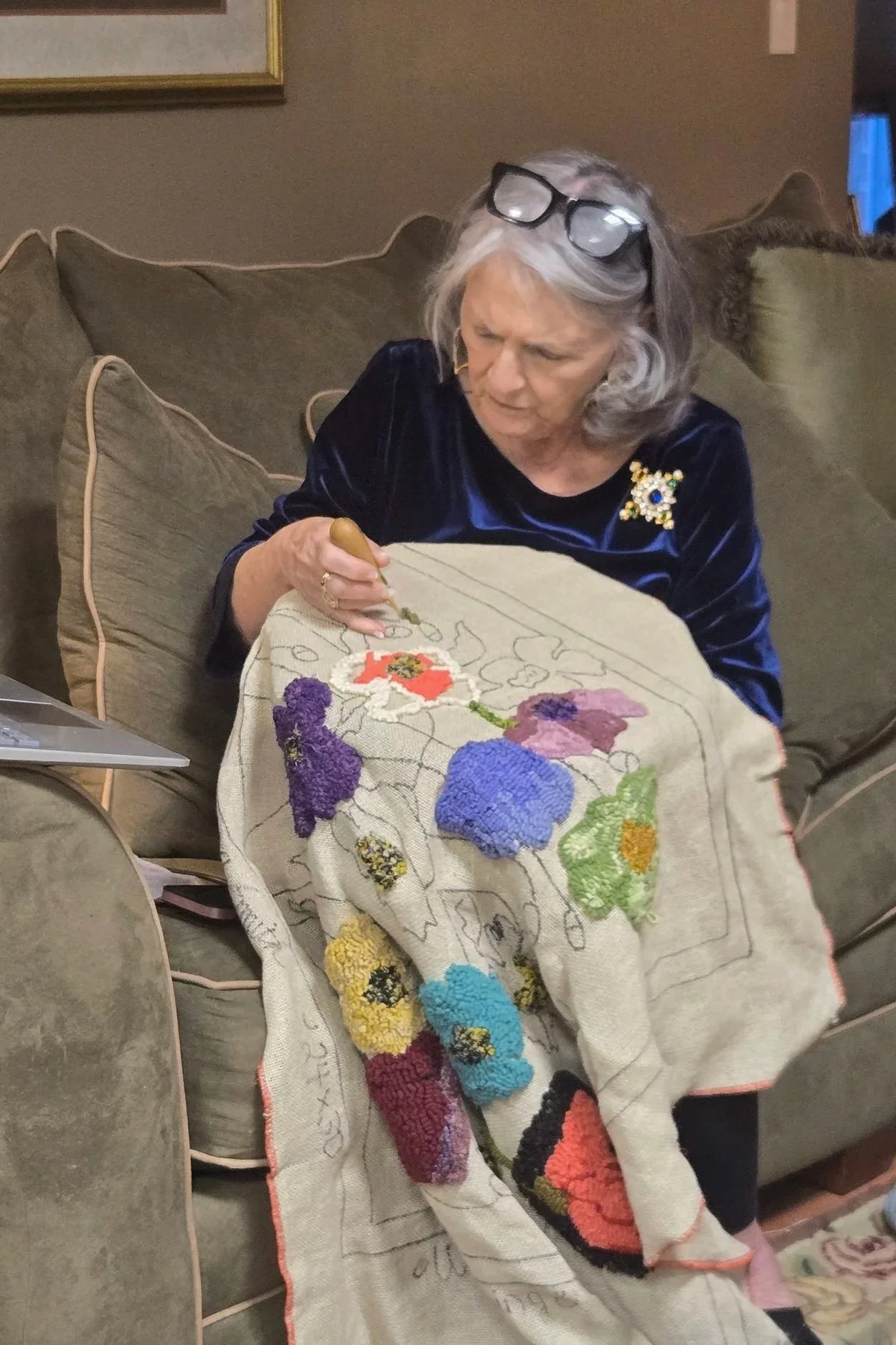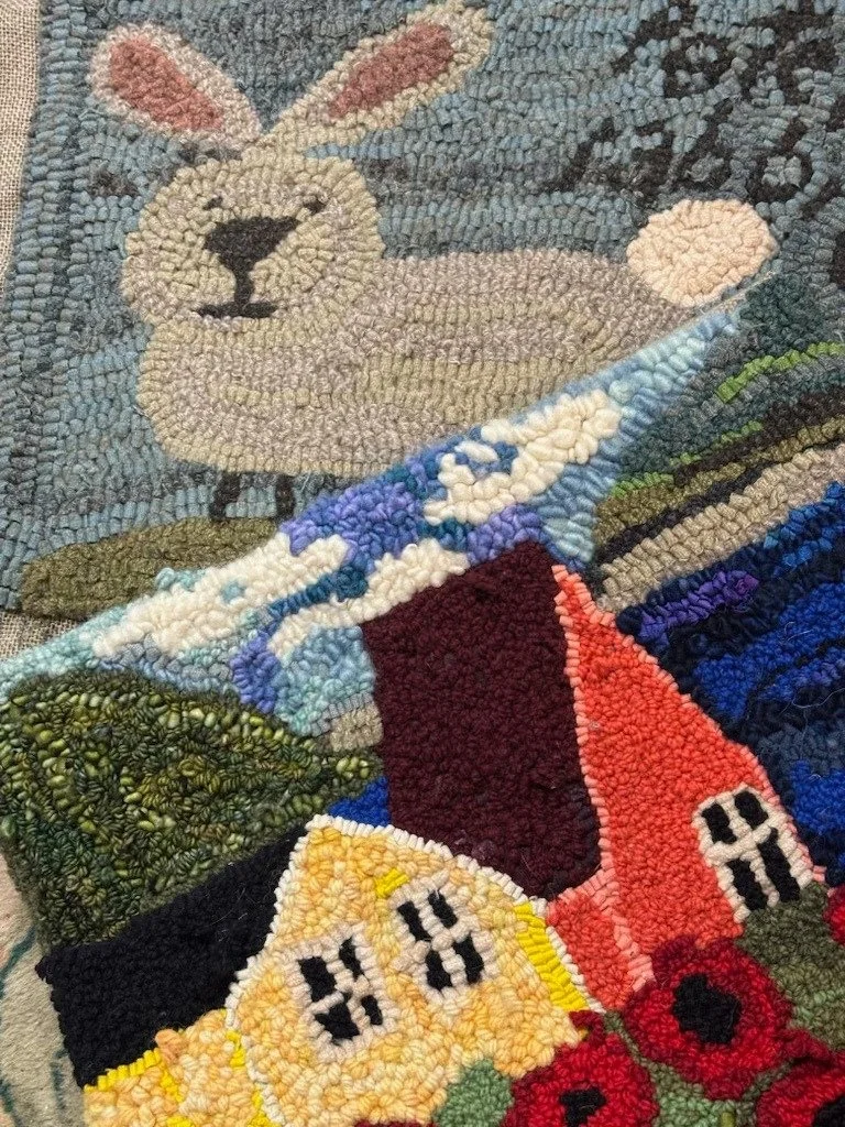 My Mississippi cousin, Jane, introduced me to “rug hooking,” which became popular between 1830 and 1850 in first Nova Scotia, then Maine. It was initially known as a “craft of poverty,” as wool scraps were used to create much-needed floor coverings to ward off Winter’s chill. While a true neophyte to the handiwork, I’ve enjoyed improving my skills by rubbing elbows with Canadian and American “professionals” in the field (their work is astounding), and look forward to once again attending the Caraway Rug School in Sophia, N.C., hosted by the extraordinary Lisanne Miller of “P Is for Primitive,” Kennebunk, Maine.