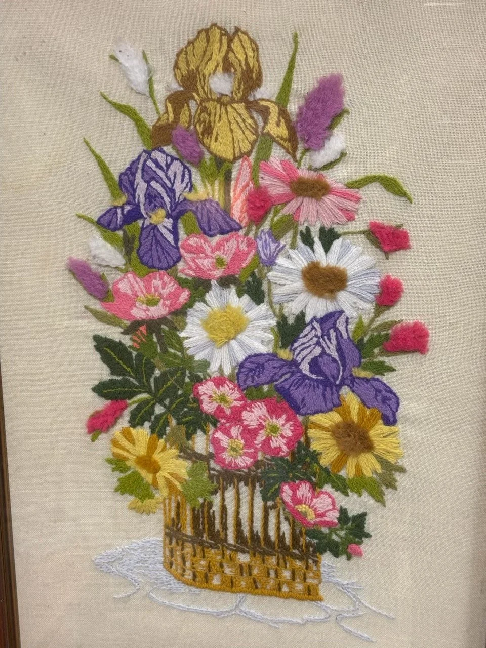 Crewel work is a style of embroidery using a thick worsted wool year, “crewel” being the old Welsh word for wool yarn. The oldest known example of crewel work is the Bayeux Tapestry, which is so impressive it has its own museum. Dating back to 1077, the approximately 229 ft tapestry depicts the events leading up to the Battle of Hastings, when William the Conqueror defeated the English army to become the first Norman king of England. In the mid-1500’s, Queen Elizabeth I, an accomplished stitcher, established the “Keepers or Wardens and Company of the Arte and Mystery of the Broderers of the City of London,” an embroidery guild run entirely by men, whose purpose was to establish the rules and standards for high quality crewel work. I completed this 18” x 30” piece in the 1980’s as a Christmas gift for my mom.